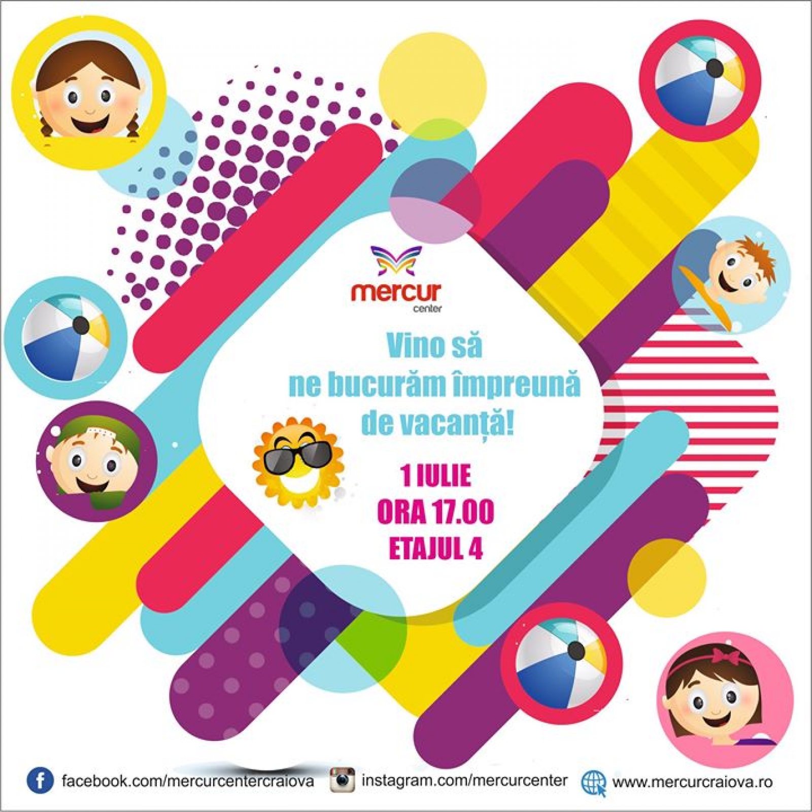 Pe 1 iulie, de la ora 17:00, te așteptăm în Mercur Center, etaj 4 să petrecem ca-n vacanță, la Atelierele Copilăriei!