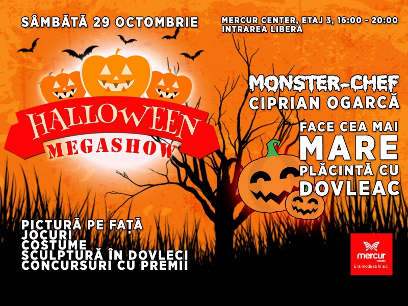 Facem cea mai mare plăcintă cu dovleac, împreună cu Monster Chef Ciprian Ogarcă (câștigător MasterChef), premiem cel mai frumos dovleac, te transformăm în personaje înfricoșătoare și îți oferim surprize de speriat!