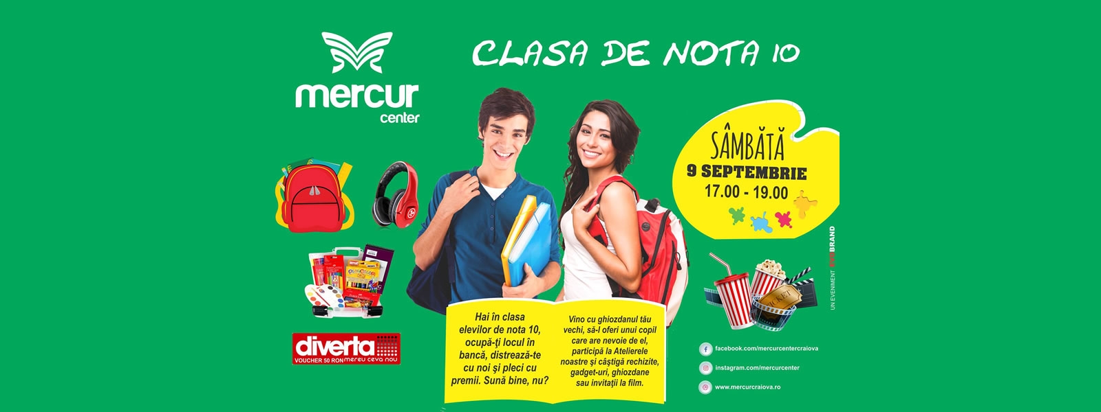 Sâmbătă, 9 septembrie, de la ora 17.00, te aşteptăm să îţi ocupi locul în bancă, să te distrezi şi să pleci cu unul din zecile de premii ce vor fi oferite: rechizite, ghiozdane, gadget-uri, vouchere de 50 RON la Diverta sau invitaţii la film!