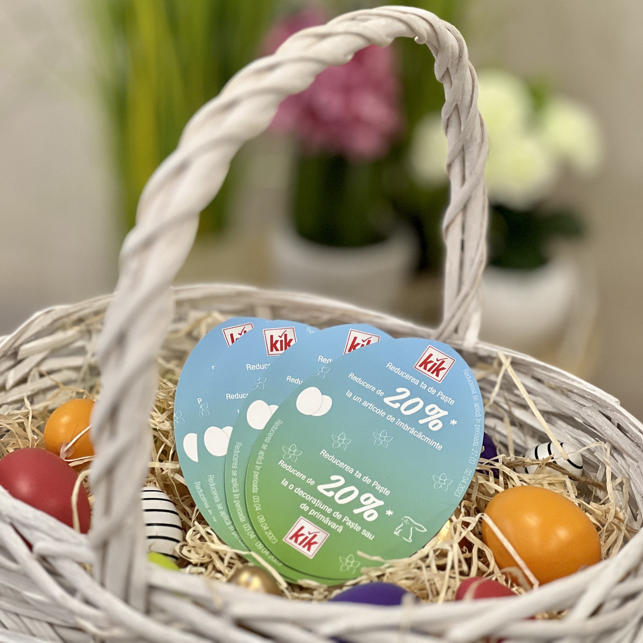 Te așteptăm până pe 26.03.2023 ca să primești unul dintre cupoanele noastre. Cu acest cupon vei primi 20% reducere la un articol vestimentar la alegere în perioada 27.03 - 02.04.2023, iar în perioada 03.04 - 09.04.2023 vei primi 20% reducere la o decorațiune de Paște/primăvară.