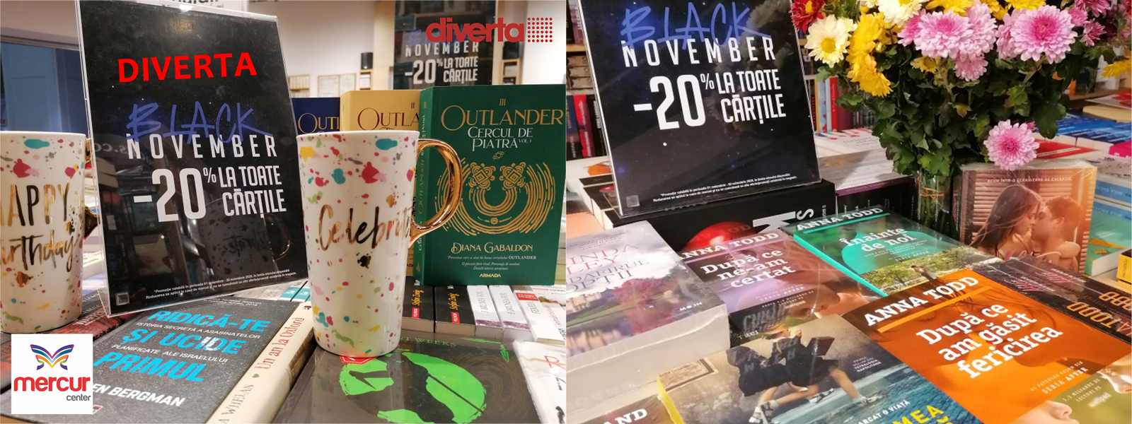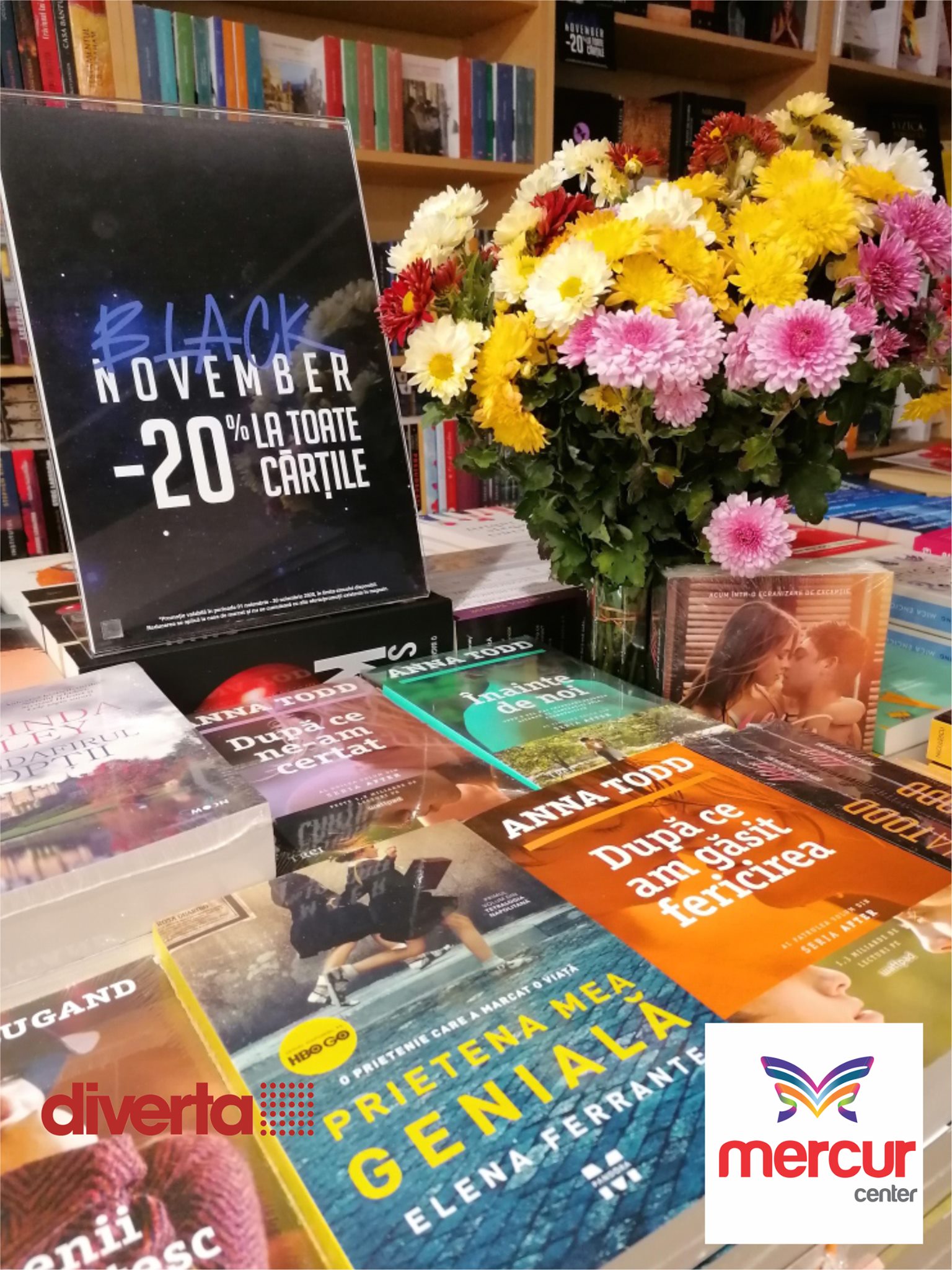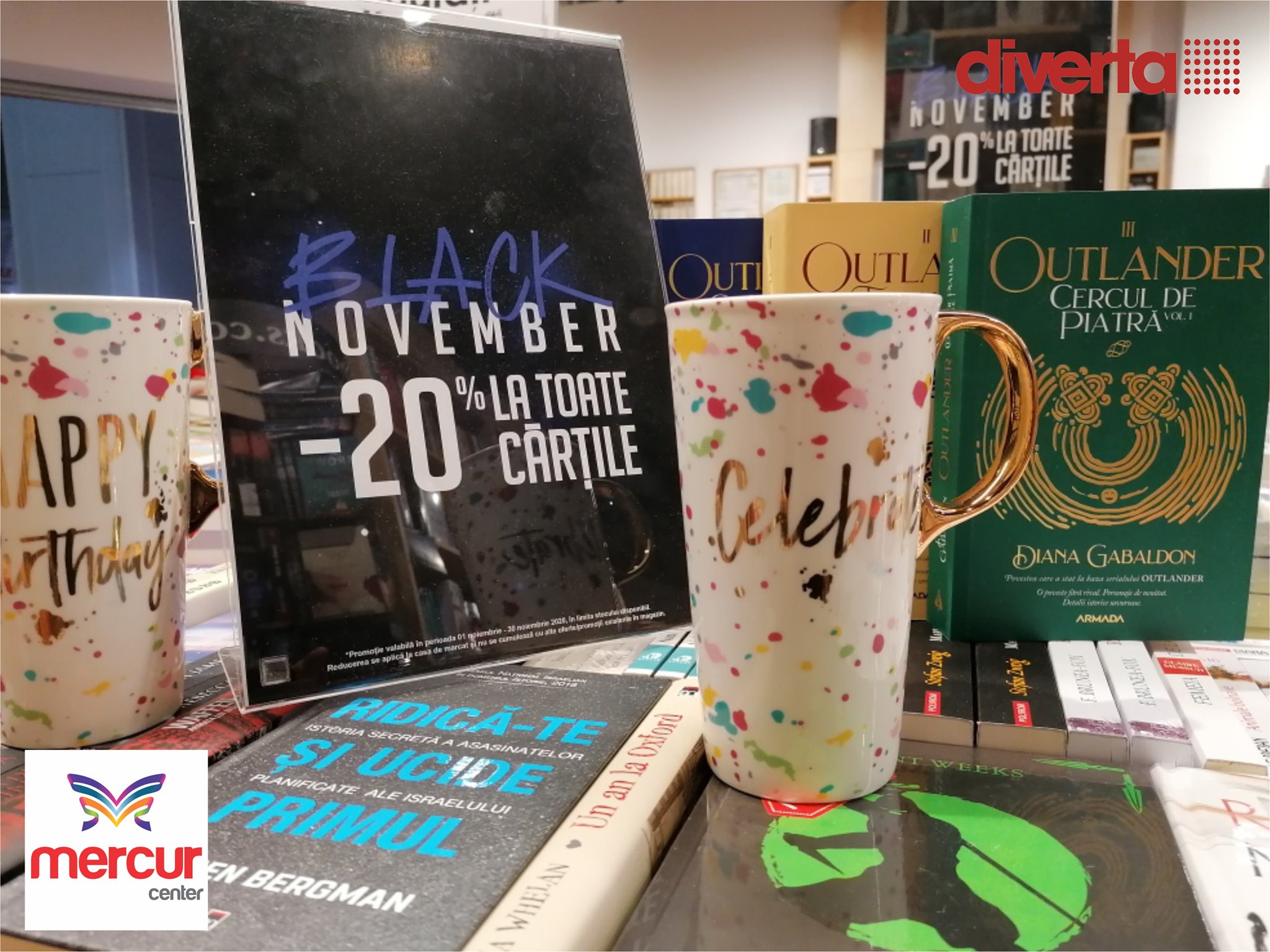 Ne-am gândit ce ar putea să vă placă mai mult decât reducerile de Black Friday și ne-am dat seama că o lună întreagă de reduceri este fix de ce are nevoie toată lumea. Prin urmare, de fiecare dată când o să ne vizitaţi în #MercurCenter, #Diverta, noi o să va întâmpinăm cu reduceri de 20% la orice carte pe care puneți ochii. Așadar, dragi cititori, NOIEMBRIE este luna în care puteți să vă umpleți biblioteca cu cele mai frumoase titluri!