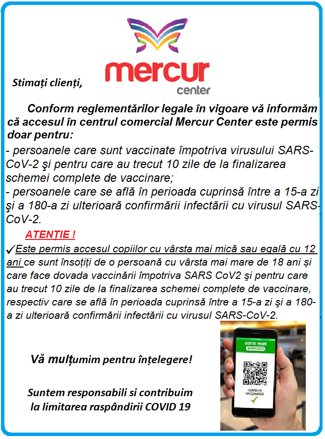 „MERCUR S.A. utilizează fişiere de tip cookie pentru a personaliza și îmbunătăți experiența ta pe website-ul nostru. Te informăm că ne-am actualizat politicile pentru a integra în acestea si în activitatea curentă a MERCUR S.A. cele mai recente modificări propuse de Regulamentul (UE) 2016/679 privind protecția persoanelor fizice în ceea ce privește prelucrarea datelor cu caracter personal și privind libera circulație a acestor date. Înainte de a continua navigarea pe website-ul nostru te rugăm să aloci timpul necesar pentru a citi și înțelege conținutul Politicii de Cookie. Prin continuarea navigării pe website-ul nostru confirmi acceptarea utilizării fişierelor de tip cookie conform Politicii de Cookie. Nu uita totuși că poți modifica în orice moment setările acestor fişiere cookie urmând instrucțiunile din Politica de Cookie.”